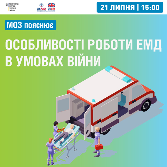 21 липня о 15:00 відбудеться вебінар «МОЗ пояснює. Особливості роботи ЕМД в умовах війни (тактичної ситуації)». Захід проводиться за сприяння Проєкту Агентства США з міжнародного розвитку (United States Agency for International Development — USAID) «Підтримка реформи охорони здоров’я».