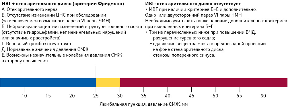 Спинномозговая пункция входит в алгоритм диагностических процедур при ИВГ, выполняется без седации в положении лежа на боку с вытянутыми ногами. В норме имеет следующие показатели высоты водного столба: ≤25 см у взрослых и ≤28 см у детей. Давление в диапазоне 25–30 см водного столба представляет собой промежуточную (серую) область, требующую осторожной трактовки, поскольку может встречаться как при патологическом, так и нормальном состояниях.