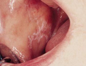 - ретикулярну — практично безсимптомна форма ЧПЛ, яка зазвичай випадково виявляється лікарем. Характеризується висипами опалового кольору та наявністю дрібних вузликів, на поверхні яких візуалізується поперечна смугастість — сітка Вікхема. Пацієнти скаржаться на зміну структури СОПР, яка стає грубшою, схожою на наждачний папір. Іноді може виникати подразнення від вживання гарячих та кислих продуктів/напоїв із розвитком еритематозних та виразкових пошкоджень на тлі довготривалого пекучого дискомфорту у ПР;