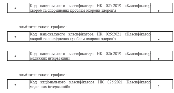 - Внести до Таблиці співставлень медичних послуг з кодами національного класифікатора НК 025:2019 «Класифікатор хвороб та споріднених проблем охорони здоров’я» та/або національного класифікатора НК 026:2019 «Класифікатор медичних інтервенцій», затвердженої наказом Міністерства охорони здоров’я України від 3 квітня 2020 р. № 773 (в редакції наказу Міністерства охорони здоров’я України від 29 березня 2021 р. № 586) такі зміни: