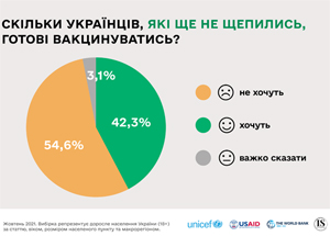 Дитячий фонд ООН (ЮНІСЕФ) в Україні провів національне репрезентативне опитування, яке показало, що 42% українців, які ще не вакцинувалися, готові щепитись за певних умов. Страх перед хворобою, досвід близьких, поради лікарів та міфи про щеплення – усе це може впливати на рішення людини вакцинуватися від COVID-19.