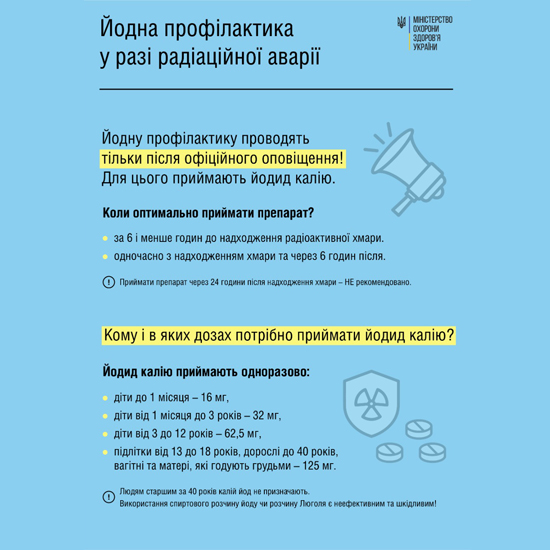 Приймати профілактичну дозу йодиду калію потрібно тільки після офіційного оповіщення про загрозу викиду та необхідність проведення йодної профілактики! Таке оповіщення проводиться місцевими органами виконавчої влади всіма доступними засобами масової інформації.