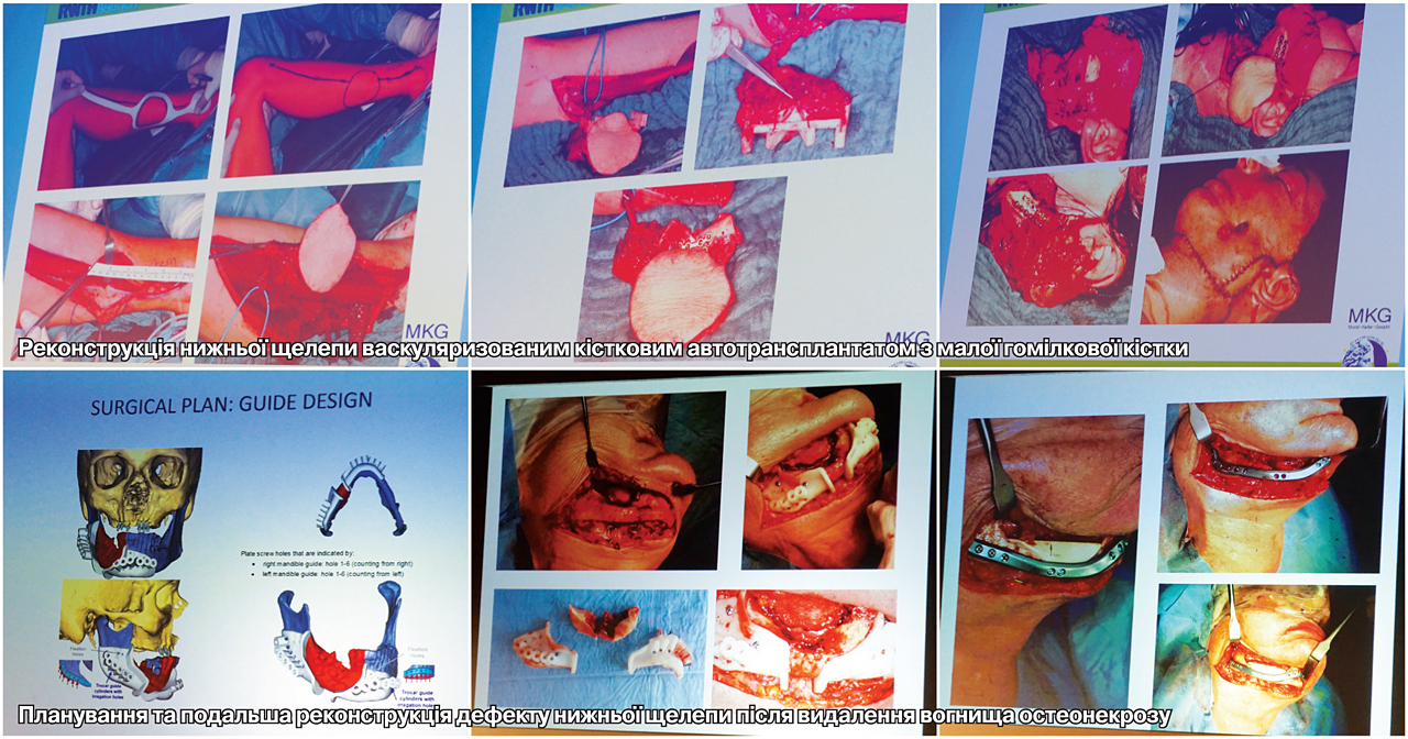 Одна з наукових секцій конгресу була присвячена питанням остеонекрозу щелепи різної етіології. Ця проблема з кожним роком стає все актуальнішою, про що свідчить збільшення кількості доповідей з цієї тематики та поява декількох монографій, а також значна кількість пацієнтів із цією нозологією (близько 250–300 випадків у Скандинавських країнах протягом 5 років). Потрібно звернути увагу на те, що, крім питань патогенезу бісфосфонатного некрозу щелепи (за новою номенклатурою конгресу — медикаментозно асоційований остеонекроз щелепи (Medication Related Osteonecrosis of the Jaws — MRONJ), багато доповідей стосувалися подальшої реабілітації цих хворих, тобто проведення реконструктивних операцій (із попереднім плануванням) із відновленням цілісності нижньої та верхньої щелеп. Викликала інтерес доповідь турецьких спеціалістів, де підкреслено значну роль препарату на основі пентоксифіліну, який застосовували з метою запобігання розвитку остеонекрозу щелепи.