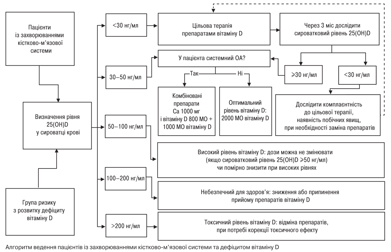 Професор В. Поворознюк торкнувся ще багатьох нозологічних форм, особливо актуальних для когорти людей літнього віку, — саркопенії та болю у спині, гіперурикемії та подагри, — а наостанок навів алгоритм ведення пацієнтів із захворюваннями кістково-м’язової системи та дефіцитом вітаміну D (рис. 3).