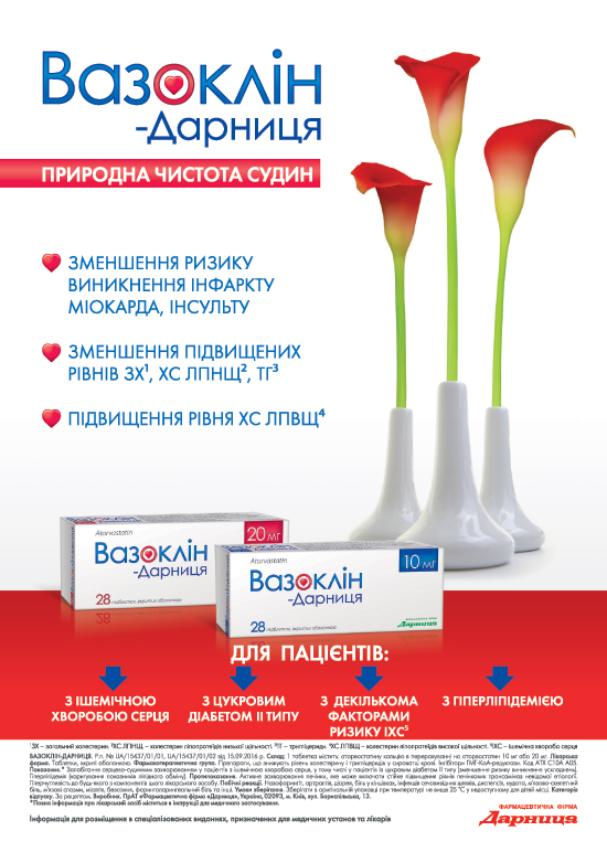 В настоящее время в Украине появился доступный аторвастатин Вазоклин-Дарница с доказанной биоэквивалентностью по отношению к оригинальному препарату и производимый на высокотехнологических мощностях компании «Фармацевтическая фирма «Дарница» в полном соответствии с требованиями GMP (Good Manufactured Practice). Препарат представлен в двух основных дозировках (10 и 20 мг), что позволяет поддерживать любые современные режимы назначения (высоко-, средне- и низкоинтенсивные) у пациентов различных категорий риска при достаточно демократичной стоимости лечения. Фактически Вазоклин-Дарница в дозе 10 мг может быть назначен пациентам с АГ, ИБС и СД и уровнями ХС ЛПНП, отличающимися от целевого на <30% (выше целевого приблизительно на 1 ммоль/л ХС ЛПНП). В свою очередь, в дозе 20 мг препарат целесообразно назначать пациентам с высоким и очень высоким кардиоваскулярным риском и уровнем ХС ЛПНП, отличающимся от целевого на 30–50% (выше целевого приблизительно на 1,2–1,5 ммоль/л ХС ЛПНП). Вазоклин-Дарница можно принимать в любое время суток независимо от приема пищи с возможностью контроля за эффективностью и безопасностью через 4 нед после инициального назначения.