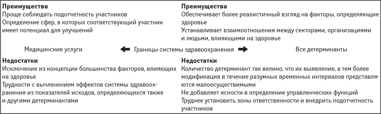 Рис. 2. Преимущества и недостатки расширения и сужения границ системы здравоохранения в рамочных концепциях, призванных оценить ее эффективность (Papanicolas I., Smith P.C., 2013)