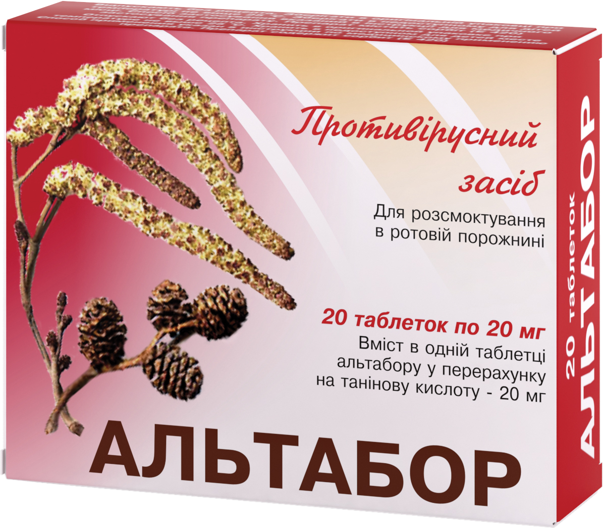 Одним из современных средств противовирусной направленности в Украине является оригинальный препарат Альтабор производства ПАО НПЦ «Борщаговский химико-фармацевтический завод». Эта растительная субстанция, содержащая сухой экстракт дубильных веществ группы эллаготанинов из соплодий ольхи серой (Alnus incana) и ольхи клейкой (Álnus glutinósa), на сегодняшний день уже подтвердила свою эффективность в доклинических и клинических исследованиях и считается перспективной в плане дальнейшего изучения. Препарат показан к применению для профилактики и лечения гриппа и острых респираторных вирусных инфекций (ОРВИ) (Компендиум — лекарственные препараты, 2017). Кроме того, имеются многообещающие результаты его клинического применения при герпесвирусной инфекции (Попова О.И., 2013).