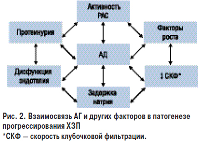 Таким образом, при ХЗП имеет место системная и локальная активация РАС, которая в свою очередь приводит к повышению степени повреждения почки: порочный круг замыкается. Взаимосвязь АГ и факторов патогенеза ХЗП представлено на рис. 2.
