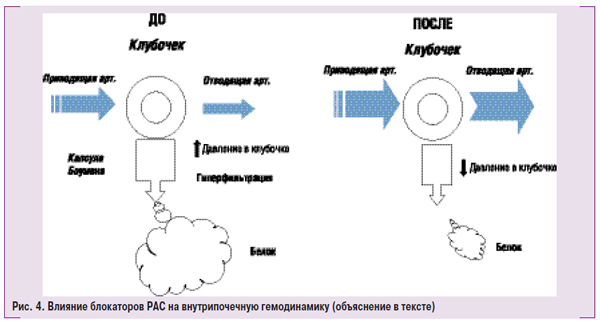 При ХЗП активация РАС является одним из ведущих компонентов патогенеза заболевания. При этом у значительной части таких больных определяется нормальный или несколько сниженный уровень активности ренина плазмы крови, в то время как активность РАС в тканях, в том числе в почках, повышается в несколько раз. В многочисленных исследованиях доказана роль РАС, особенно ее локальной экспрессии в почках, в прогрессировании ХПН. Различные гемодинамические и негемодинамические эффекты РАС, включая повышение системного и интрагломерулярного давления, активацию роста и воспаление в почечных тканях, повышение реабсорбции натрия, создание условий для протеинурии (повышение мезангиальной проницаемости для макромолекул), принимают участие в прогрессировании заболевания. Показано, что активация РАС в почках происходит преимущественно в участках, которые окружают уже сформированную рубцовую ткань.