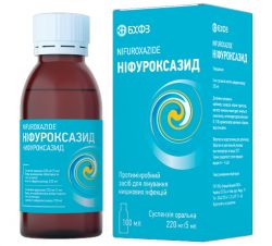 Состав: 5 мл суспензии содержит 220 мг нифуроксазида (220 мг/5 мл). Фармакотерапевтическая группа. Противомикробные средства, применяемые для лечения при кишечных инфекциях. Код АТС. A07AX03. Фармакологические свойства. Нифуроксазид — противомикробный препарат, производное 5-нитрофурана. Локальная активность и отсутствие проникновения в органы и ткани организма предопределяет уникальность нифуроксазида по сравнению с другими производными нитрофурана, поскольку отсутствует системное действие этого антидиарейного препарата. Эффективен в отношении грамположительных и грамотрицательных бактерий: Streptococcus pyogenes, Staphylococcus aureus, Escherichia coli, Salmonellae, Shigellae. Побочные эффекты: нифуроксазид практически не вызывает развития побочных эффектов, изредка возможны проявления индивидуальной повышенной чувствительности.