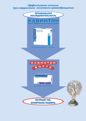 В настоящее время спектр препаратов с нейропротекторным действием достаточно широк, что позволяет подобрать оптимальное лекарственное средство каждому больному с учетом индивидуальных особенностей центральной и церебральной гемодинамики, сосудистой реактивности, состояния сосудистой стенки. Одним из препаратов, который позитивно влияет на состояние церебральной гемодинамики, является Кавинтон. Он ингибирует фосфодиэстеразу и активирует аденилатциклазу, повышает содержание циклического гуанозинмонофосфата (цАМФ) и аденозинтрифосфорной кислоты (АТФ), усиливает кровоток, расширяет сосуды мозга, улучшает его снабжение кислородом и переносимость гипоксии. Препарат активирует аэробную утилизацию глюкозы, а также метаболизм норадреналина и серотонина в тканях мозга, уменьшает агрегацию тромбоцитов, повышенную вязкость крови, способствует деформируемости эритроцитов и блокирует поглощение ими аденозина. Препарат избирательно улучшает гемореологические параметры и микроциркуляцию в головном мозге, уменьшает сопротивление спазмированных сосудов мозга, что предотвращает феномен «обкрадывания» (нормализует кровоснабжение ишемизированной области). Таким образом, Кавинтон обладает вазоактивным, нейропротекторным и гемокорректорным действием, что является важным в терапии ишемического инсульта.