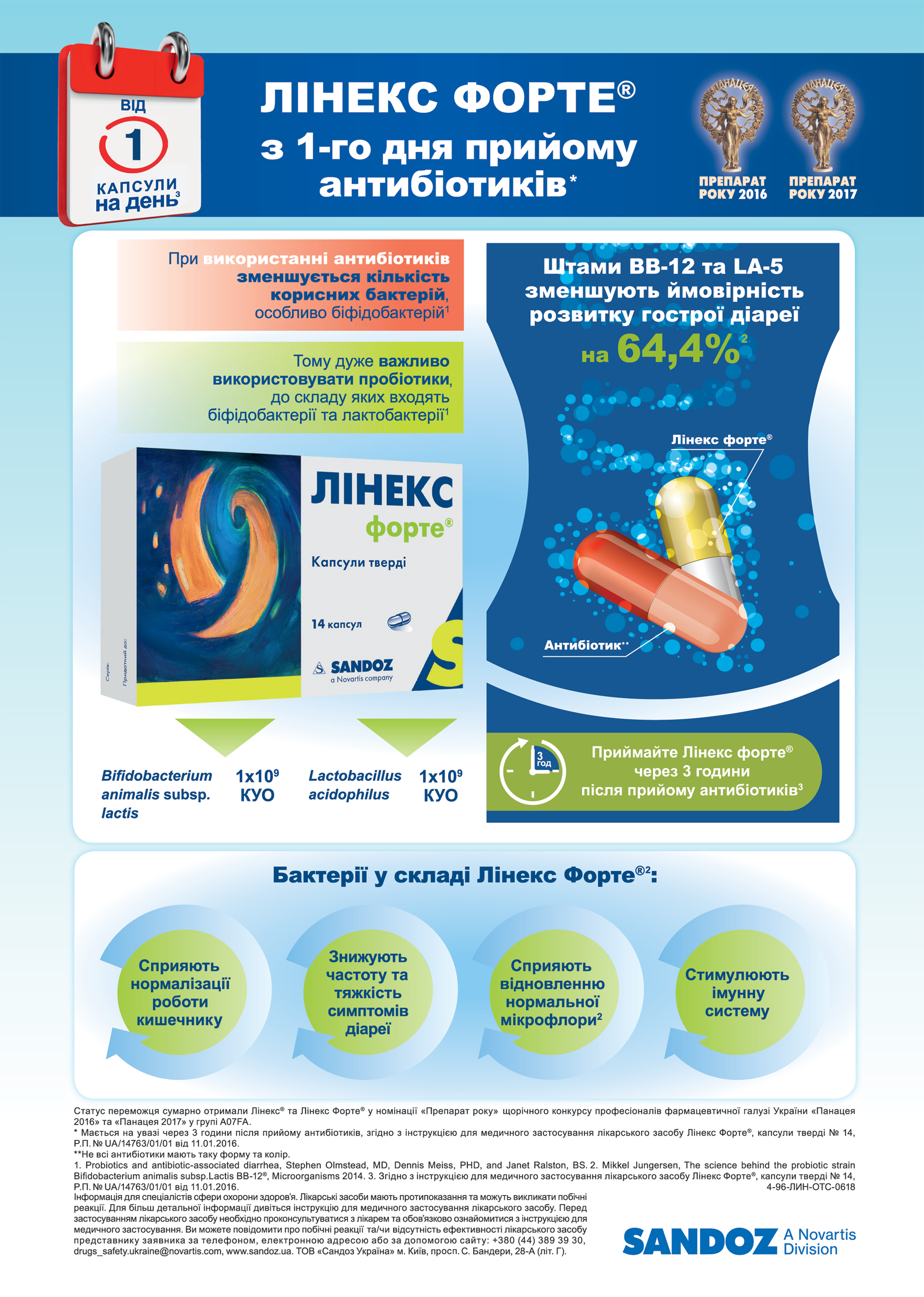 Лекарственные средства имеют противопоказания и могут вызвать побочные реакции. Для более подробной информации смотрите инструкцию по медицинскому применению лекарственных средств. Перед применением препаратов необходимо проконсультироваться с врачом и обязательно ознакомиться с инструкцией по применению. Вы можете сообщить о побочных реакциях и/или отсутствии эффективности лекарственного средства представителю заявителя по телефону, электронной почте или с помощью сайта: +380 (44) 389-39-30, [email protected], www.sandoz.ua. ООО «Сандоз Украина» г. Киев, просп. С. Бандеры, 28-А (буква Г)».