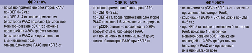 Выполнение теста на наличие функционального почечного резерва (ФПР) (Гоженко А.И. и соавт., 2015; Иванов Д.Д., Гоженко А.И., 2018), который подробно проанализирован в предыдущей публикации, вносит коррективы в описанную тактику ренопротекции блокаторами РААС (рис. 2).