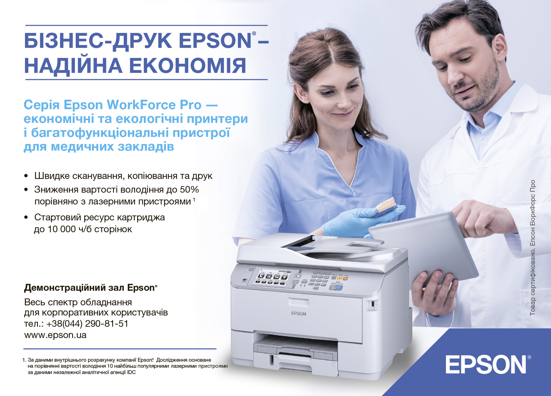 Відповідно до наказу Міністерства охорони здоров’я України від 26.01.2018 р. № 148, кількість принтерів або багатофункціональних пристроїв (БФП) має відповідати кількості робочих місць персоналу. Тому сьогодні лікарі мають вибрати друкуючу техніку, яка зможе максимально задовольнити потреби конкретного медичного закладу і стане надійним та економічно доцільним рішенням. Сучасний ринок друкуючих пристроїв розділяють компанії, які спеціалізуються на технологіях лазерного і струменевого друку. Струменеві принтери все більше витісняють лазерні завдяки інноваційним розробкам, які дозволили удосконалити їх за всіма ключовими показниками. Незмінним світовим лідером на ринку струменевого друку є компанія «Epson», яка пропонує українським медичним закладам рішення для покращення якості та швидкості обслуговування пацієнтів. За основу парку друкуючої техніки в будь-який медичний заклад варто вибрати швидкісний струменевий монохромний БФП «Epson WorkForce Pro WF-M5690DWF», головними перевагами якого є: