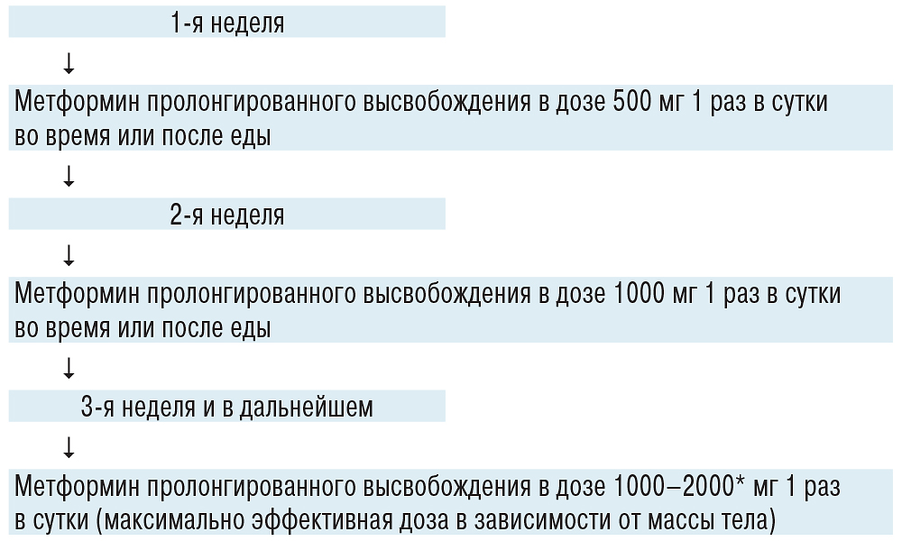 Основная задача применения метформина — профилактика ухудшения состояния углеводного обмена и развития СД 2-го типа. Целесообразно контролировать уровень глюкозы плазмы крови натощак 1 раз в 3 мес, проводить пероральный глюкозотолерантный тест 1 раз в 6 мес на фоне отмены метформина или определять уровень HbA1с без отмены препарата.