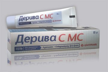 ДЕРИВА С МС. Лікарська форма. Гель. Фармацевтичні характеристики. Основні фізико-хімічні властивості: однорідний гель від білого до жовтого кольору. Склад. Діючі речовини: 1 г гелю містить адапалену (мікронізованого) 1 мг, кліндаміцину (у вигляді кліндаміцину фосфату) 10 мг; допоміжні речовини: динатрію едетат, карбомер 940, пропіленгліколь, метилпарагідроксибензоат (Е218), полоксамер 407, феноксіетанол, натрію гідроксид, вода очищена. Фармакотерапевтична група. Препарати для лікування акне для місцевого застосування. Код АТХ D10А D53. Показання. Місцеве лікування звичайних вугрів (acne vulgaris). Побічні реакції. Почервоніння, лущення, сухість, свербіж і печіння шкіри у місці нанесення гелю одразу після його нанесення, яке минає в подальшому. Алергічні реакції, реакції фоточутливості, акне, відчуття поколювання, грамнегативний фолікуліт, шлунково-кишкові розлади, біль у животі, кропив’янка, підвищена жирність шкіри, контактний дерматит. Категорія відпуску. Без рецепта. Виробник. «Гленмарк Фармасьютикалз Лтд.»/Glenmark Pharmaceuticals Ltd. Місцезнаходження. Plot No. E-37/39, M.I.D.C., Industrial Estate, Satpur, Nasik-422 007, Maharashtra, India/Дільниця № Е-37/39, Ем. Ай. Ді. Сі., Сатпур, Насік-422 007, Махараштра, Індія. Р.п. № UA/14954/01/01, строк дії необмежений з 07.11.2018 р. З повною інформацією про лікарські засоби можна ознайомитися у відповідних інструкціях для медичного застосування.