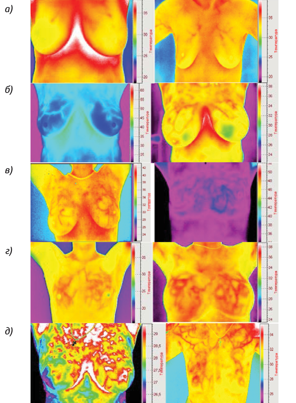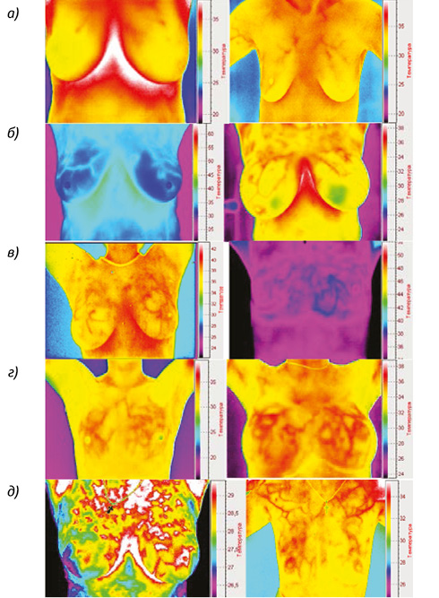 До 1-го типу (рисунок а) включені термограми з однаковою температурою по всій поверхні МЗ, безсудинні або зі слабким проявом судинного малюнка. Термограми МЗ з помірною двобічною васкуляризацією відносно симетричною, із 2–3 судинами вузької та довгої форми й постійним світінням біля внутрішньогрудного сплетіння або біля навколососкового кружка продемонстровані на рисунку б. Третій тип судинного малюнка МЗ (рисунок в) демонструє наявність двобічної васкуляризації з однаковим перерізом судин або збільшенням окремих судин. На рисунку г представлені термограми МЗ із сіткоподібною двобічною гіперваскуляризацією. На підставі опрацювання отриманих термограм ми визнали за доцільне введення 5-го типу характеристики судинного малюнка, для якого характерна концентрація судин різної форми та їх скупчення у верхніх квадрантах МЗ (рисунок д). Як свідчить практика, встановлення діагнозу в цьому випадку викликає певні труднощі.