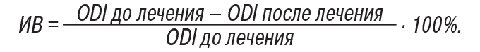 Количественную и качественную оценку болевого синдрома проводили на основании визуальной аналоговой шкалы (ВАШ) боли. Для оценки степени нарушения жизнедеятельности, обусловленной патологией позвоночника, использовали индекс нетрудоспособности Освестри (Оswestry Disability Index — ODI) и анкетирование Роланда — Морриса (Roland — Morris Disability Questionary — RDQ). Индекс выздоровления (ИВ), характеризующий степень восстановления после консервативного лечения, рассчитывали для каждого пациента через 3–5 дней после блокады и через 1 и 3 мес после проведенного лечения (Hirabayashi K. et al., 1981):