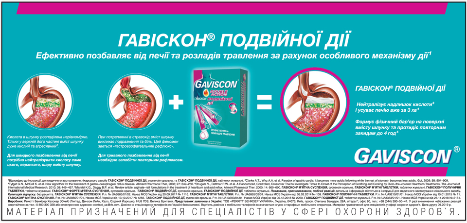 Особливої уваги заслуговує альгінатно-антацидний комплекс Гавіскон подвійної дії, який створює стійкий альгінатний бар’єр — «пліт», який «плаває» на поверхні шлункового вмісту та здатний зменшити кількість рефлюксних подій (Kahrilas P.J. et al., 2012). До того ж альгінат спроможний витісняти «кислотну кишеню» у пацієнтів із симптоматичним рефлюксом (Rohof W. et al., 2012; Savarino E. et al., 2012), а також чинить захисну дію на слизову оболонку стравоходу, оскільки наділений біоадгезивним потенціалом (Woodland P. et al., 2015).