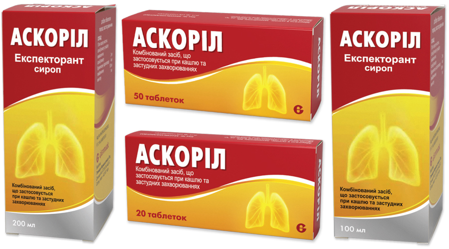 Варто зазначити, що препарат випускається у 4 формах: АСКОРІЛ ЕКСПЕКТОРАНТ — сироп 100 мл та 200 мл, а також АСКОРІЛ — таблетки, № 20 і № 50. АСКОРІЛ ЕКСПЕКТОРАНТ у формі сиропу зручно застосовувати у дітей, він показаний для малюків віком від 2 років.