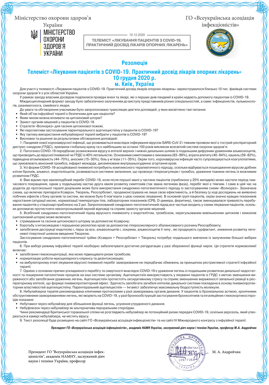 Про ефективність парентерального застосування ацетилцистеїну у пацієнтів із септичним шоком відомо багато років (Bernard G.R., 1991; Jepsen S., 1992; Ortolani O., 2000), а про його ефективність як пневмопротектора світ дізнався нещодавно, що дозволило суттєво розширити уявлення про механізми реалізації позитивних ефектів ацетилцистеїну при гострих та хронічних захворюваннях респіраторного тракту. Y. Zhang та співавторами (2017) продемонстровано, що терапія парентеральним ацетилцистеїном асоціювалася зі зменшенням/запобіганням ураженню легень у пацієнтів із ГРДС. Сьогодні парентеральний ацетилцистеїн входить до списку життєвонеобхідних препаратів, затвердженого Всесвітньою організацією охорони здоров’я, що пояснюється його високою біодоступністю (вища в 10 разів порівняно з пероральною формою), високою концентрацією в легенях, що важливо для забезпечення пневмопротекторного та антиоксидантного ефектів, та відсутністю подразливої дії на слизову оболонку шлунку. Враховуючи дані попередніх досліджень, а також досвід застосування при інших захворюваннях, застосування ацетилцистеїну є виправданим для лікування пацієнтів, інфікованих SARS-CoV-2. Одним із представників ацетилцистеїну на ринку України є Інгаміст («Юрія-Фарм») у формі для інгаляційного, ендобронхіального та парентерального застосування.