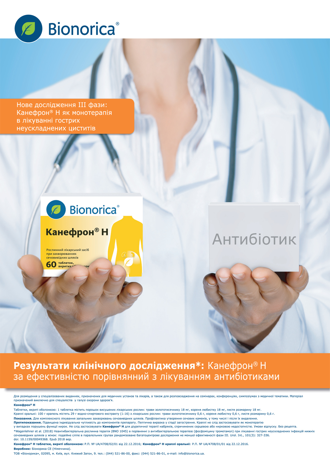 У 2017 р. німецька клінічна настанова з епідеміології, діагностики, лікування, профілактики та ведення дорослих пацієнтів із неускладненими ІСШ (German Clinical Guideline on Epidemiology, Diagnostics, Therapy, Prevention, and Management of Uncomplicated Urinary Tract Infections in Adult Patients) дозволила лікувати неускладнений цистит симптоматично, без подальшої антибіотикотерапії [11]. У 2019 р. національні рекомендації Асоціації урологів Польщі (Polish Urological Association) включили Канефрон® Н як альтернативу антибіотикам у лікуванні гострого неускладненого циститу [12].