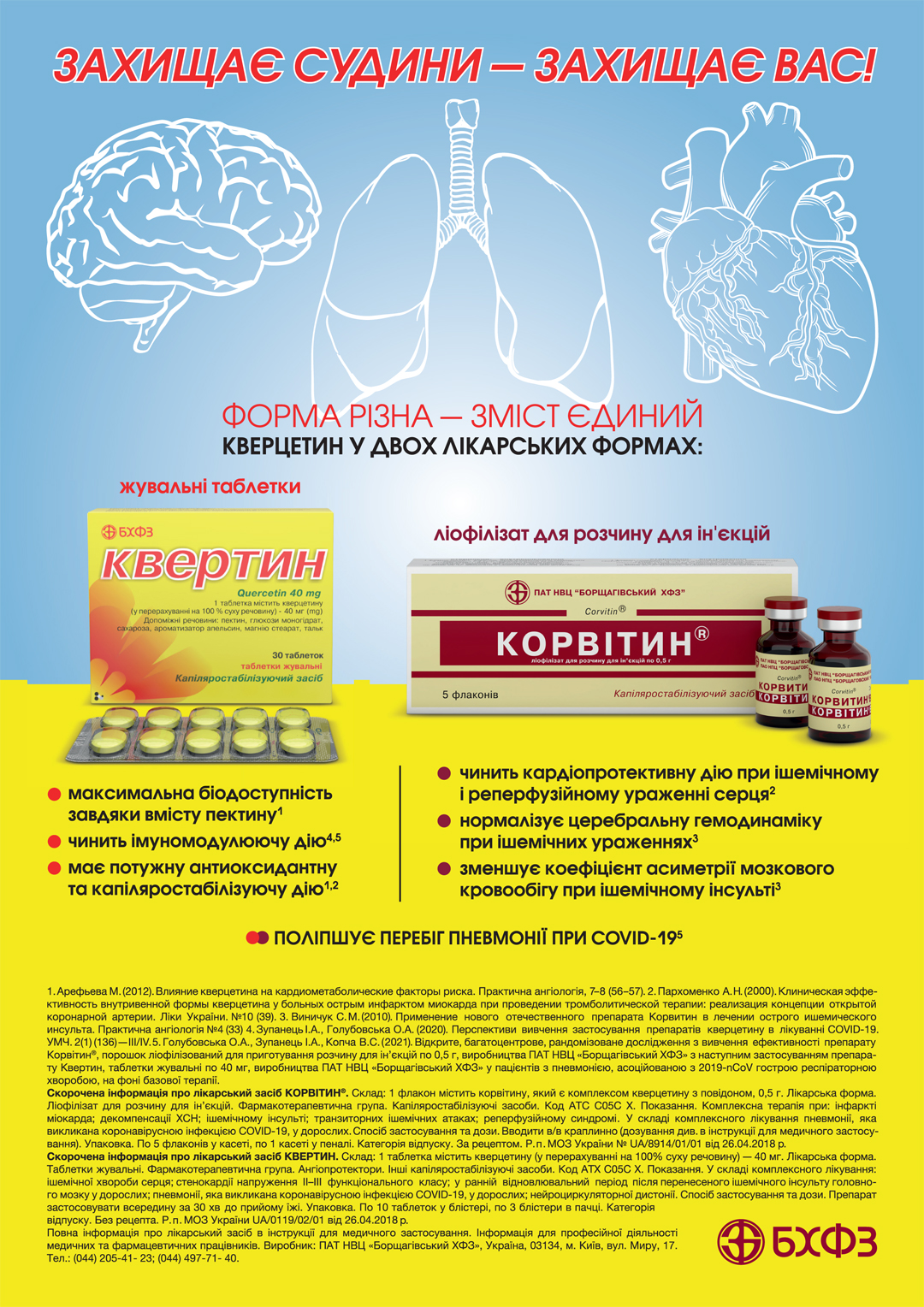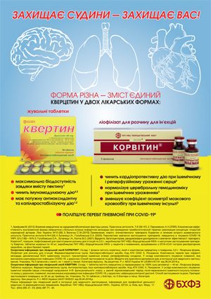 Вже у травні 2020 р. для підтвердження концепції щодо терапевтичного ефекту кверцетину при лікуванні пневмонії на фоні коронавірусної хвороби як засобу патогенетичної терапії було детально обґрунтовано, розроблено і проведено (протягом 2020–2021 рр.) КВ із застосуванням саме ЛЗ, які містять кверцетин (Корвітин®, порошок ліофілізований для приготування розчину для ін’єкцій по 0,5 г, та Квертин, таблетки жувальні по 40 мг, які виробляються та є власною розробкою ПАТ НВЦ «Борщагівський ХФЗ», Україна). Ці ЛЗ знаходяться на фармацевтичному ринку України та інших країн вже >10 років і накопичений достатній обсяг інформації щодо їх ефективності у лікуванні різних патологічних станів: у складі комплексної терапії гострого порушення коронарного кровообігу та інфаркту міокарда, гострого ішемічного порушення мозкового кровообігу та хронічних ішемічних уражень головного мозку, лікуванні та профілактиці реперфузійного синдрому при хірургічному лікуванні хворих з облітеруючими захворюваннями артерій нижніх кінцівок, профілактиці НПЗП-гастропатії, при хронічному гломерулонефриті тощо. До речі, ці ЛЗ мають високий рівень безпеки застосування [19–28].