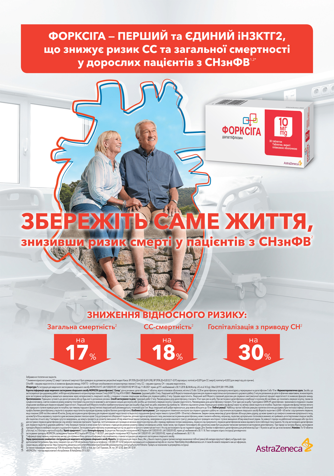 Враховуючи кардіопротекторний ефект іНЗКТГ-2, на сучасному етапі відкриваються нові можливості для лікування хронічної СН (ХСН). Так, результати рандомізованих клінічних досліджень демонструють, що іНЗКТГ-2 здатні чинити істотний позитивний вплив на виживання та ризик виникнення декомпенсації у пацієнтів із ХСН та зниженою фракцією викиду (ФВ) лівого шлуночка (ЛШ). У 2019 р. опубліковані результати міжнародного мультицентрового рандомізованого подвійного сліпого дослідження DAPA-HF щодо оцінки впливу іНЗКТГ-2 (дапагліфлозину) на частоту погіршення перебігу СН або ССС у пацієнтів із СН зі зниженою ФВ (СНзнФВ), незалежно від статусу ЦД [6]. У дослідження включено 4744 дорослих пацієнти (вік ≥18 років) із СН II–IV функціонального класу за класифікацією Нью-Йоркської асоціації кардіологів (New York Heart Association — NYHA) та ФВ ЛШ <40% протягом останніх 12 міс. Пацієнти отримували стандартну терапію інгібітором ангіотензинперетворювального ферменту (іАПФ), чи блокатором рецепторів ангіотензину (БРА) II, або інгібітором рецепторів ангіотензину і неприлізину (іРАН) та блокаторами β-адренорецепторів, а також антагоністами мінералокортикоїдних рецепторів (АМКР) у рекомендованих дозах за відсутності протипоказань або непереносимості. Учасники дослідження також мали концентрацію N-кінцевого пропептиду натрійуретичного гормону (NT-proBNP) ≥600 пг/мл (≥400 пг/мл, якщо пацієнт був госпіталізований з приводу СН протягом останніх 12 міс).