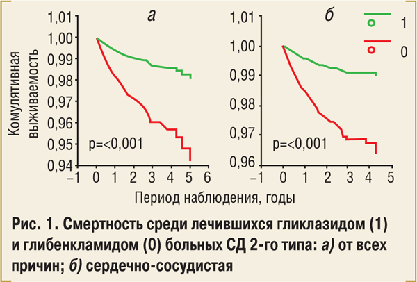 according to age, diabetes duration, and gender for glibenclamide treated DM2 patients turned out to be 2.57 (1.73–3.82) and 2.93 (1.83–4.71) respectively. Further multifactor adjusting (fasting blood glucose, body mass index, systolic blood pressure) had not influenced these results. CONCLUSIONS. Glibenclamide treatment of DM2 is associated with much greater risk of general and cardio-vascular mortality, comparing to gliclazide treatment.