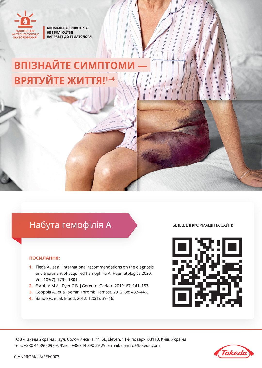 Набута гемофілія A (НГA) характеризується утворенням у пацієнтів аутоантитіл, які називають інгібіторами, проти фактора згортання крові VIII (FVIII) [1]. НГA — рідкісне захворювання, яке уражує як чоловіків, так і жінок різного віку [2]. Зазвичай відмічають два піки захворюваності на НГA: перший пов’язаний з періодом вагітності, другий — зі старшим віком (>60 років). У близько половини пацієнтів із НГA виявляють супутні розлади, найчастіше інші аутоімунні захворювання або злоякісні новоутворення [3, 4]. Приблизно в 1–5% випадків НГA діагностують у період вагітності або протягом 1-го року після пологів [5]. Фенотип кровотеч при НГA варіює, починаючи з небезпечних для життя до помірних кровотеч або їх відсутності. Для НГA характерні підшкірні гематоми, які можуть бути першою ознакою захворювання.