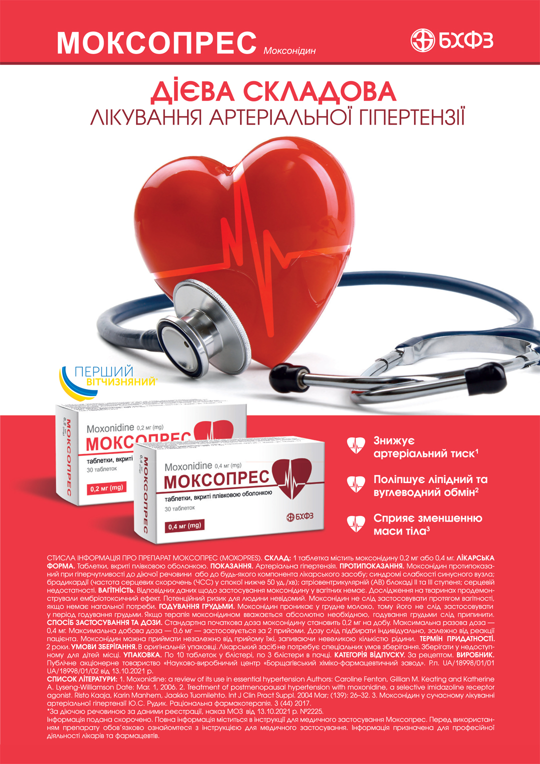 Таким чином, одними із необхідних вимог до призначення антигіпертензивних препаратів мають бути їх висока антигіпертензивна ефективність, органопротекція, синергічна взаємодія з іншими класами антигіпертензивних препаратів, хороша переносимість, позитивний або принаймні нейтральний вплив на метаболізм ліпідів та вуглеводів. Моксонідин, який застосовують в клінічній практиці >20 років, на сьогодні є найчастіше застосовуваним антигіпертензивним препаратом з центральним механізмом дії. Вивчення властивостей моксонідину на досить великій вибірці пацієнтів із АГ та супутніми метаболічними порушеннями показало високу антигіпертензивну ефективність препарату як у складі комбінованої терапії, так і окремо. Враховуючи сучасні дані, що в більшості пацієнтів із АГ визначають супутні фактори ризику, які виступають водночас факторами активації симпатоадреналової системи, виправданим є застосування антигіпертензивних препаратів, в основі фармакологічної дії яких лежать зниження симпатичної гіперактивації та додаткові плейотропні ефекти, які повною мірою притаманні препарату моксонідин.