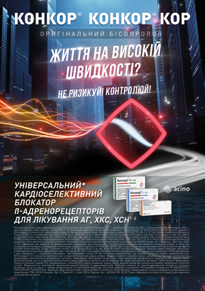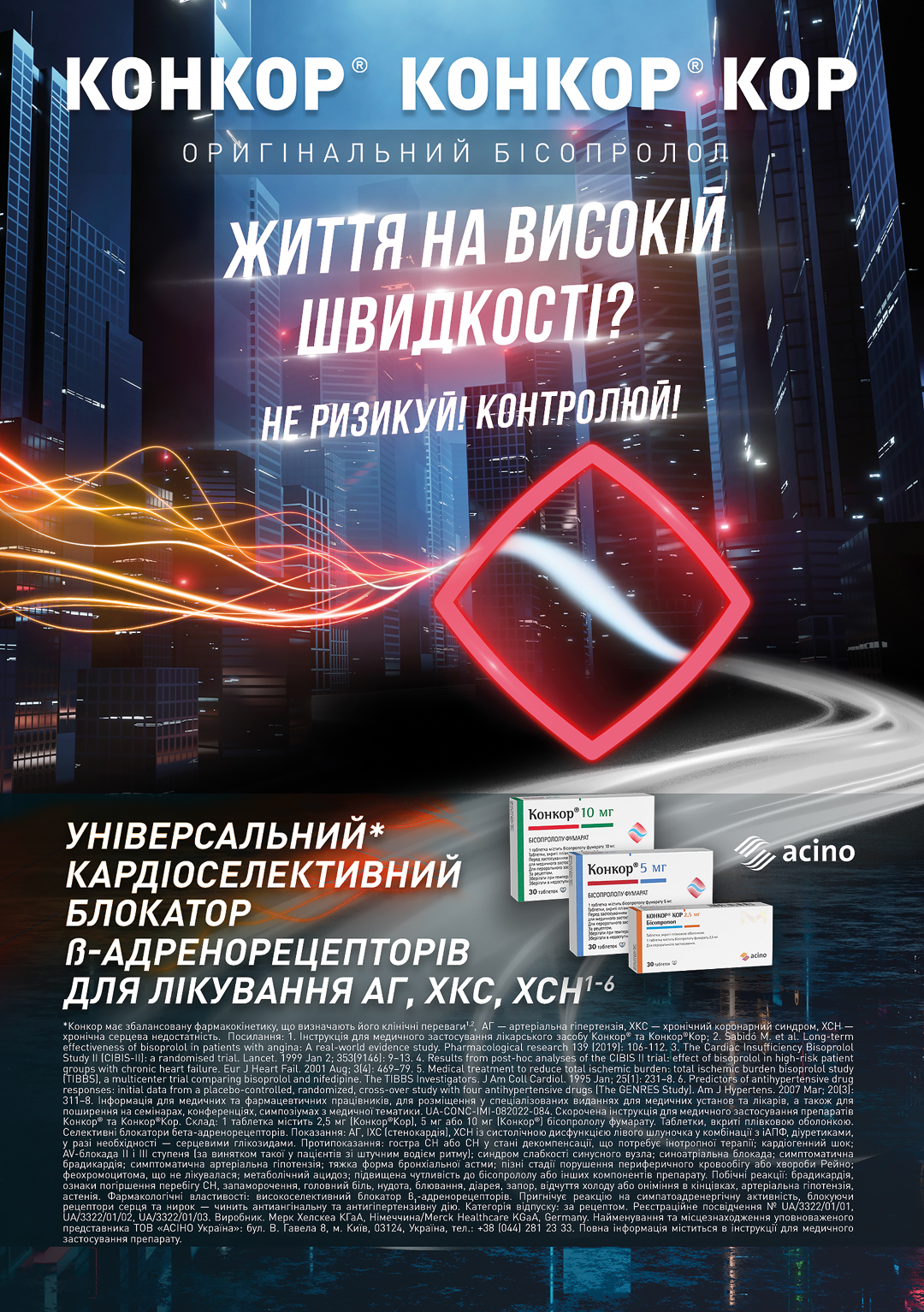 На вітчизняному фармацевтичному ринку оригіналь-ний бісопролол Конкор® (5 та 10 мг бісопрололу) та Конкор® Кор (2,5 мг бісопрололу) представляє швейцарська фармацевтична компанія «Acino», якій з 1 січня 2018 р. належить виключне право на комерційну реалізацію і просування низки продукції Merck KGаA (Німеччина) в Україні. Ці препарати добре відомі українським фахівцям завдяки високій якості, передбачуваній клінічній ефективності, хорошому профілю безпеки. Особливості механізму дії та фармакологічні характеристики бісопрололу (Конкор®) зумовлюють високу афінність до серцевих β1-АР, відсутність ефекту метаболізму першого проходження через печінку. Для препарату характерні висока біодоступність (яка не залежить від особливостей та швидкості метаболізму) та рівномірно розподілений між печінкою та нирками кліренс, тривалий період напіввиведення. Препарат позбавлений значного негативного впливу на гладкі м’язи бронхів, вуглеводний та ліпідний обмін, еректильну функцію. Усе це забезпечує передбачуваний ефект щодо ЧСС, артеріального тиску та цілодобовий антиішемічний та антигіпертензивний захист. Саме тому Конкор® можна призначати один раз на добу та рекомендувати хворим з такою коморбідною патологією, як цукровий діабет, ожиріння, а також чоловікам молодого віку, особам з дисліпідемією. Головним аргументом на користь бісопрололу (Конкор®) є його здатність покращувати виживання хворих на АГ, стенокардію порівняно з іншими ББА.