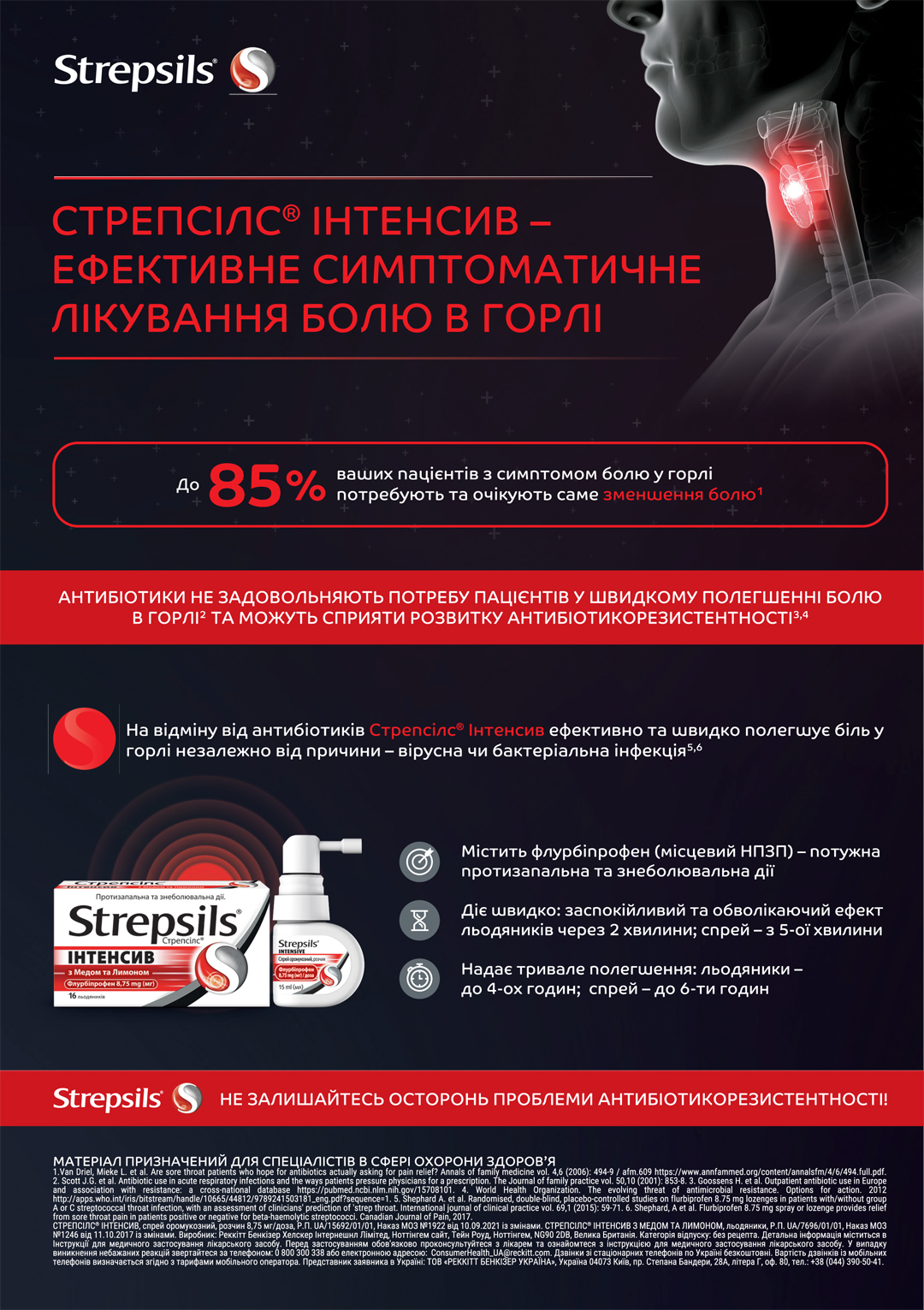 Флурбіпрофен 8,75 мг у складі препаратів Стрепсілс® Інтенсив спрей оромукозний та льодяники Стрепсілс® Інтенсив з медом та лимоном проникає у глибокі шари слизової оболонки глотки й діє в зоні запалення, швидко та протягом тривалого часу полегшує навіть виражені симптоми. У випадку, коли АБТ є клінічно виправданою, застосування флурбіпрофену дозволяє підвищити якість життя пацієнта вже з початку місцевої терапії та потенційно зменшити тривалість застосування антибіотиків. Місцеве застосування флурбіпрофену як симптоматичного засобу при болю в горлі сприяє скороченню необґрунтованого призначення АБТ і, відповідно, зменшенню тягаря АБР.