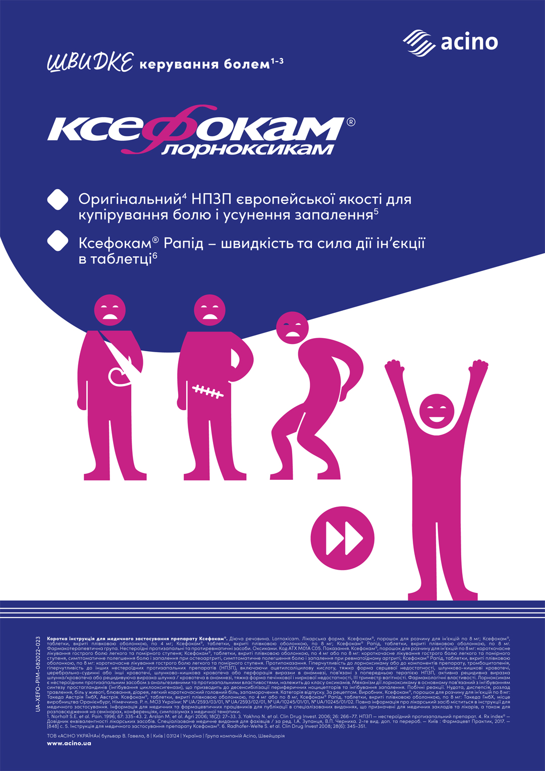 - 7. Цурко В., Хитров Н., Агапова Л. (2005) Клиническая оценка внутрисуставного введения лорноксикама (ксефокама) у больных ревматоидным гонартритом. Практич. мед., 1(10): 62–63.