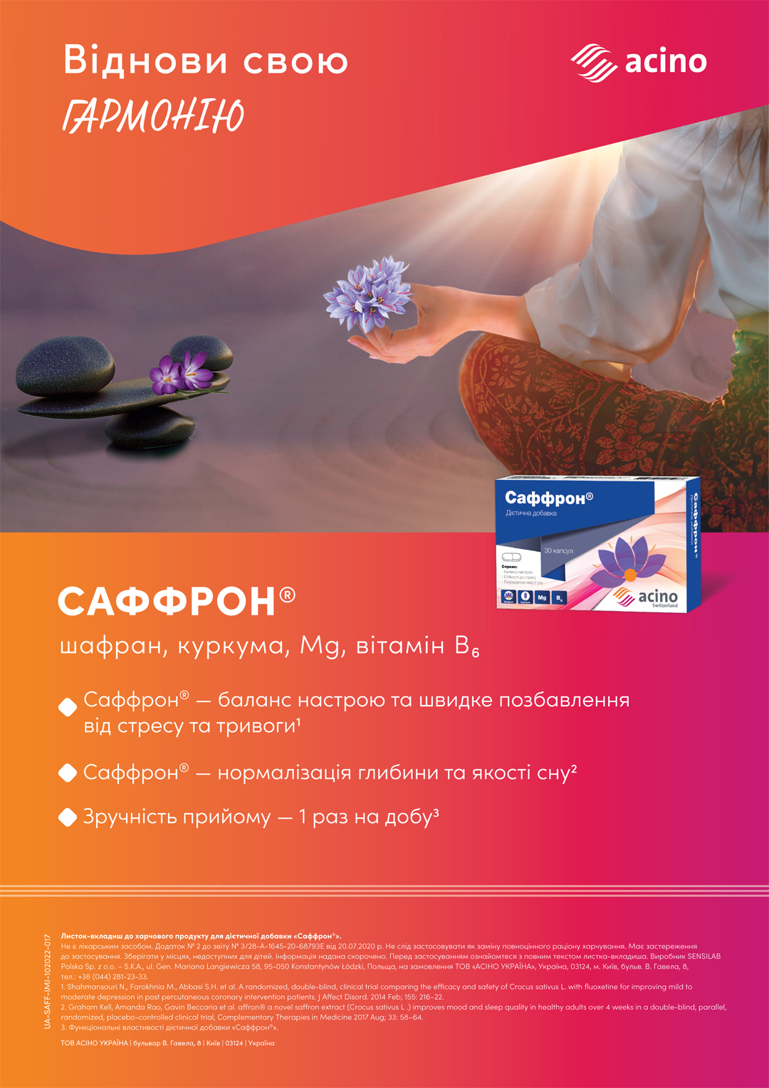 Наситити організм біологічно активними речовинами, про які йдеться в цій статті, допомагає Саффрон® — комбінація екстрактів шафрану, кореня куркуми, магнію та вітаміну В6. Завдяки наявності у складі шафрану та куркуміну його можна рекомендувати пацієнтам із депресією, у тому числі тим, які отримують НІЗЗМ/СІЗЗС. Піридоксин (вітамін В6) позитивно впливає на продукування норепінефрину та серотоніну, підвищуючи їх продукування при депресії, що пов’язано з його участю як кофактора дофа-декарбоксилази в процесі синтезу катехоламінів. Магній знижує збудливість нейронів та пригнічує нервово-м’язову передачу. Ефективне поєднання складових підтримує нормальний функціональний стан нервової та серцево-судинної систем, посилює стійкість до психічної та стресової напруги, сприяє розумовій рівновазі та балансу настрою, нормалізації глибини та якості сну. Безумовно корисною ця комбінація може бути для пацієнтів середнього віку з депресією легкого та помірного ступеня, особливо з атиповим перебігом.