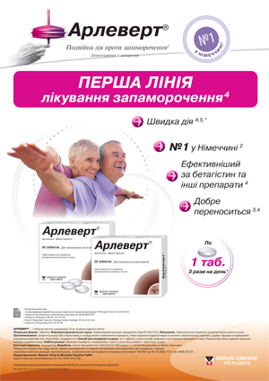 Наведені дані доказової медицини свідчать, що оптимальним вибором для симптоматичного лікування центрального та периферичного вертиго є призначення ФК цинаризин/дименгідринат [17–18]. На вітчизняному ринку зазначену комбінацію представляє фармакологічна компанія «Berlin-Chemie» під торговою назвою Арлеверт®. Цинаризин (20 мг) та дименгідринат (40 мг), які містяться в кожній таблетці Арлеверт®, сприятливо впливають на периферичний (вушний лабіринт) та центральний (ядра вестибулярного нерва) відділи вестибулярного аналізатора, завдяки чому протидіють виникненню запаморочення, поліпшують мозковий кровообіг та забезпечують помірну протиблювотну дію. Застосування ФК цинаризин/дименгідринат (Арлеверт®) сприяє повному нівелюванню вертиго різного генезу у 24,7% та майже остаточному зникненню запаморочення — у 69,9% пацієнтів. Схема лікування вертиго, ефективність та безпека якої доведені даними доказової медицини, ґрунтується на призначенні 1 таблетки Арлеверт® 3 рази на добу протягом 4 тиж; за необхідності тривалість терапії може бути продовжена.