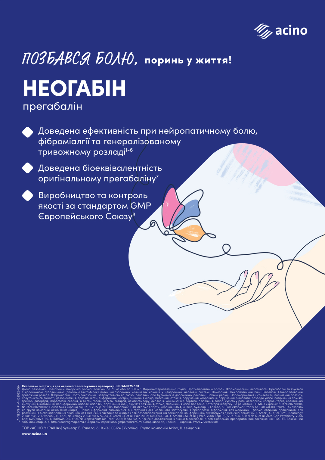 Рекомендації, що ґрунтуються на доказах, наприклад, Спеціалізованої групи IASP з проблем нейропатичного болю (Neuropathic Pain Special Interest Group — NeuPSIG), рекомендують прегабалін як засіб першої лінії лікування НБ поряд з іншими лікарськими засобами, включаючи трициклічні антидепресанти, інгібітори зворотного захоплення серотоніну/норадреналіну та габапентин [8]. Французька настанова відносить габапентин до терапії другої лінії, а в першу включають лідокаїн для місцевого застосування та черезшкірну магнітну стимуляцію [9]. Його також рекомендують в якості засобу першої лінії терапії при діабетичній нейропатії [10–12], НБ внаслідок травм спинного мозку [13], ВІЛ-інфекції [14], синдромі неспокійних ніг [15], фіброміалгії [16], постгерпетичній невралгії [17]; в якості першої–другої лінії — при тригемінальній невралгії [18, 19].