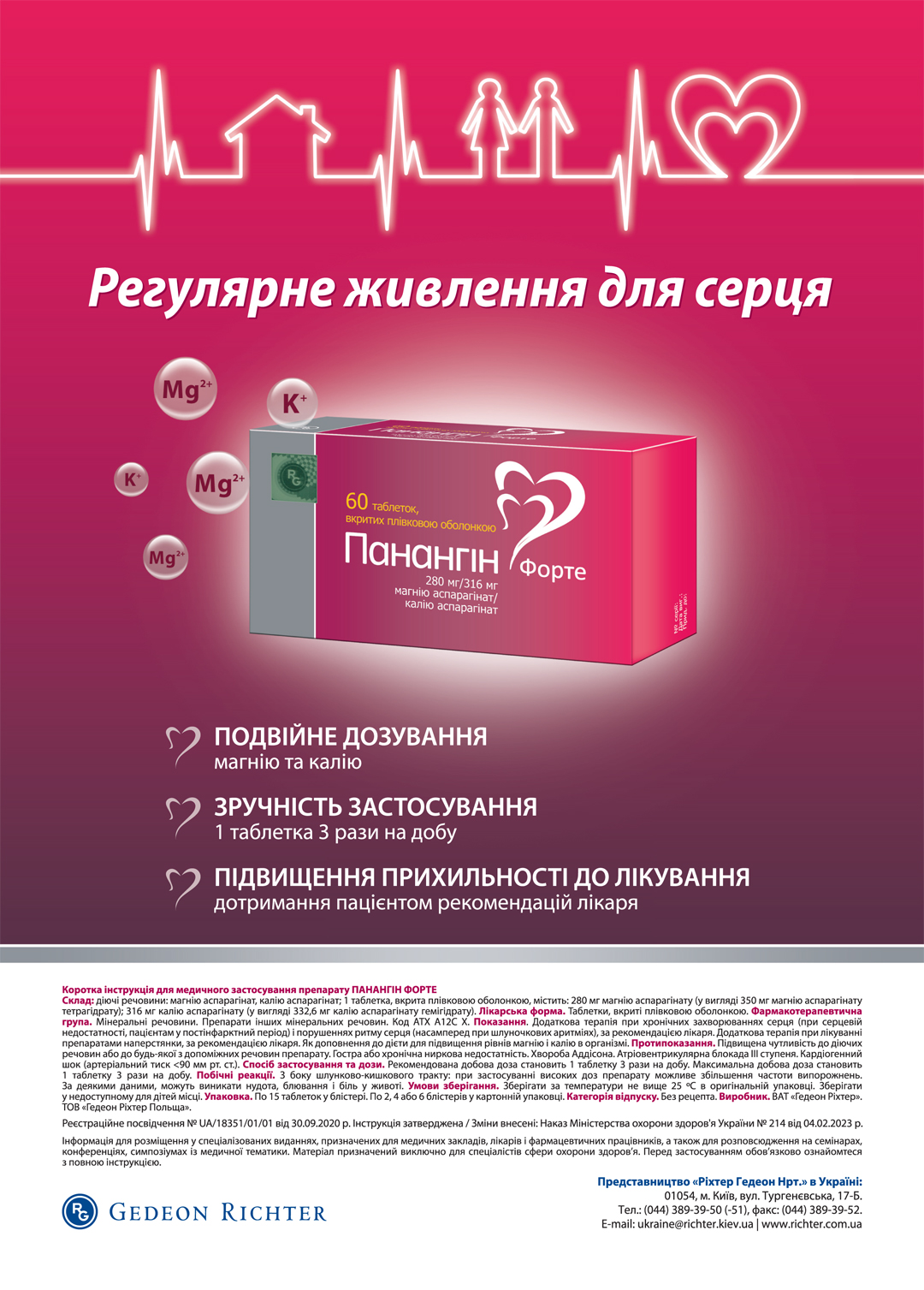 У якості додаткової терапії при хронічних захворюваннях серця (при серцевій недостатності, пацієнтам у постінфарктний період) та порушеннях ритму серця (насамперед при шлуночкових аритміях), а також як доповнення до дієти з метою підвищення рівнів магнію і калію в організмі можна рекомендувати препарат Панангін форте (ВАТ «Гедеон Ріхтер»), який містить ці природні макроелементи. У складі 1 таблетки Панангін форте — 280 мг магнію аспарагінату і 316 мг калію аспарагінату. Добова доза препарату відповідає 70,8 мг магнію (22,8% мінімальної добової норми) та 217,2 мг калію (8,7% мінімальної добової норми). Слід зазначити, що аспарагінова кислота має виражену здатність підвищувати проникність мембран для іонів калію та магнію, бере активну участь у синтезі АТФ та виявляє адаптогенний ефект. Зручний прийом препарату по 1 таблетці 3 рази на добу забезпечує організм необхідною добовою дозою зазначених макроелементів. До того ж саме такий режим гарантує кращу біодоступність іонів K+ та Mg2+, ніж застосування 1–2 рази на добу. Поєднання у складі Панангін форте найважливіших макроелементів, які відіграють ключову роль у регуляції роботи серцево-судинної системи, зручність застосування препарату забезпечують високу прихильність до лікування і дозволяють покращити результати основної терапії у пацієнтів із ССЗ.