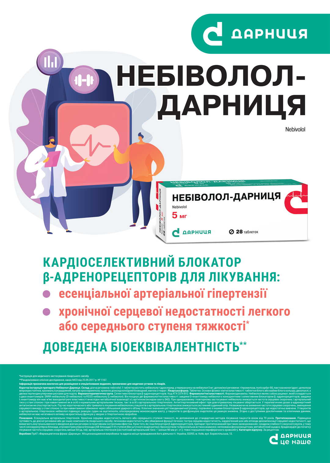 Препарат небівололу високої якості відповідно до умов Належної виробничої практики (Good Manufacturing Practice — GMP) в Україні випускає провідний виробник — ПрАТ «Фармацевтична фірма «Дарниця». Небіволол-Дарниця, згідно з результатами дослідження, є біоеквівалентним препарату німецького виробника [30]. Так, межі 90% довірчого інтервалу для відношення геометричних середніх значень максимальної концентрації (Cmax) та площі під фармакокінетичною кривою (AUC0–t) для досліджуваного та референтного препаратів небівололу становили 95,37–110,30% та 92,70–102,75% відповідно. Доступність вітчизняного лікарського засобу із доведеною біоеквівалентністю розширює можливість вибору клінічно та економічно ефективної терапії.