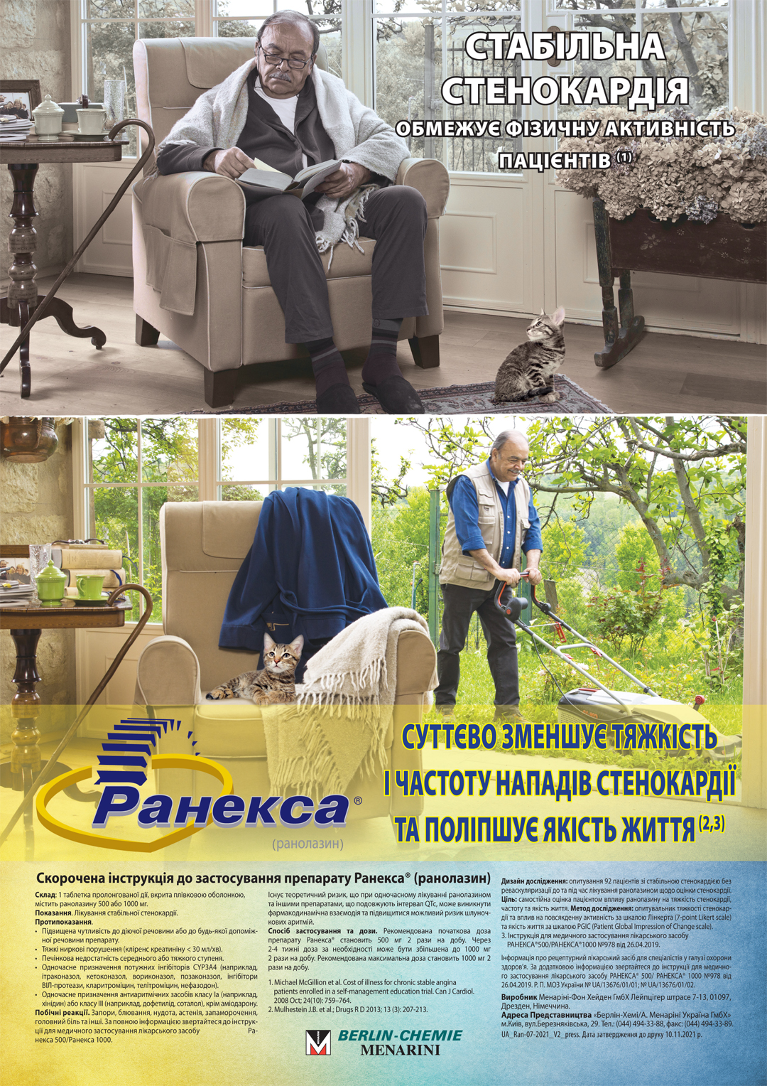 2. Доведена клінічна ефективність, гемодинамічна нейтральність, відмінна переносимість, добре вивчений профіль безпеки, можливість застосування у пацієнтів із супутніми захворюваннями дозволяє ранолазину стати хорошим доповненням до антиішемічних засобів, що є в арсеналі лікаря, і зайняти гідне місце в ряду препаратів для антиангінальної терапії.