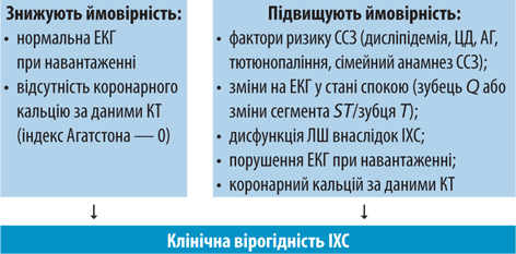Щодо наявності ІХС є певні питання. Перед тим як встановлювати цей діагноз, слід оцінити ймовірність наявності ІХС за шкалою Європейського товариства кардіології (European Society of Cardiology — ESC), яка враховує стать, вік, типовість/атиповість наявної клінічної симптоматики (у пацієнтки Г.І. вона є неангінозною, нетиповою) (табл. 2). У той самий час останні рекомендації Американської асоціації серця (American Heart Association — AHA) свідчать, що у віковому діапазоні, до якого належить обстежувана пацієнтка, у більшості хворих біль у грудній клітці має некардіальне походження і слід дуже ретельно зважувати стосовно цього діагнозу [3].