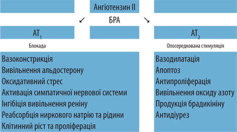 | Стимуляція захисних ефектів через АТ2-рецептори | Одночасне зниження захисних ефектів ангіотензину II (через АТ2-рецептори) |