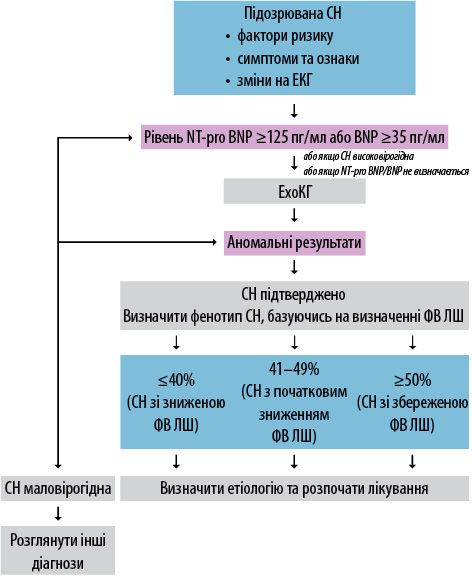 З метою підтвердження/виключення діагнозу ІХС можна використати додаткові дослідження для виявлення ураження коронарних судин або функціональні дослідження для виявлення ішемії (рис. 1). Більшість пацієнтів низького ризику можуть бути направлені на проведення мультиспіральної КТ — і це є дуже потрібним для досліджуваної пацієнтки. Питання щодо задишки, наявності набрякового синдрому потребують підтвердження/виключення СН. За алгоритмом ESC, на тлі обов’язкового врахування симптомів та ознак має бути виконане лабораторне дослідження на вимірювання рівня мозкового натрійуретичного пептиду (NT-pro BNP) та проведення ехоКГ з урахуванням як структурних, так і морфологічних уражень серця (рис. 2).