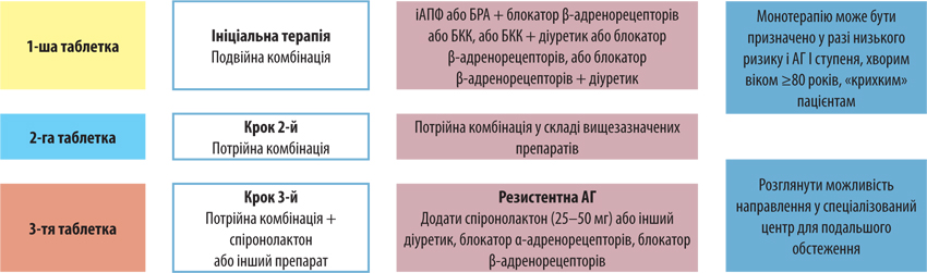 Оскільки пацієнтка має підвищений АТ і підозру на наявну ІХС, слід призначити терапію ще до її повторного візиту. Загалом рекомендації щодо ведення пацієнтів із АГ визначають пріоритетність застосування фіксованих комбінацій (рис. 3). У випадку, що розглядається, має бути призначена подвійна фіксована комбінація БРА + блокатор β-адренорецепторів або БКК. Вбачається за доцільне призначити пацієнтці фіксовану комбінацію на основі валсартану та амлодипіну, аби одразу взяти під контроль АТ. Попередньо у хворої наявні ознаки СН із гіперволемією, тому є обґрунтованим призначення петльових діуретиків задля досягнення умов еуволемії. Оскільки є підозра на ІХС, пацієнтці рекомендовано мати при собі нітрогліцерин, хоча, аналізуючи наявні дані, швидше за все має місце неішемічний компонент стосовно скарг, пов’язаних із больовими відчуттями в ділянці серця.