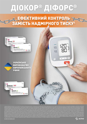 - валсартан/амлодипін (Діфорс 160) 160/5 мг 1 раз на добу вранці під контролем АТ;