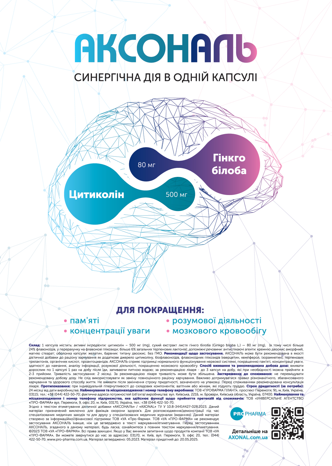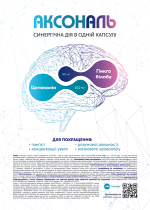 Таким чином, поєднання цитиколіну та екстракту гінкго білоба в комплексі Аксональ дає змогу максимально урізноманітнити та посилити можливості впливу на провідні механізми розвитку ішемії ГМ та клінічні синдроми, які виникають при цьому, адже водночас впливає на причину (кровообіг) та наслідки (дегенерація нейронів та їх компонентів — мітохондрій) порушень когнітивних та неврологічних функцій.