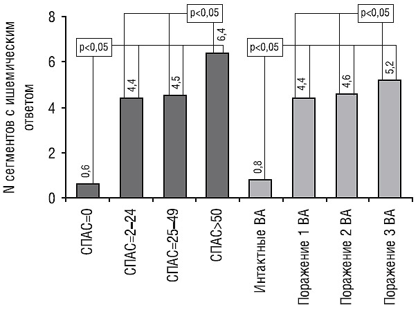 При распределении пациентов на группы по количеству пораженных ВА были отмечены значимые различия в количестве сегментов с ишемическим ответом между пациентами с интактными ВА (0,8±1,4 сегмента) и с поражениями одного, двух и трех ВА (4,4±2,5 сегмента, 4,6±2,4 сегмента и 5,2±3,3 сегмента, p<0,05). Не было получено статистически значимых различий в количестве сегментов с ишемическим ответом между пациентами с разным количеством пораженных ВА, отмечали лишь тенденцию к большему количеству сегментов с ишемическим ответом с увеличением количества пораженных ВА (рис. 1).