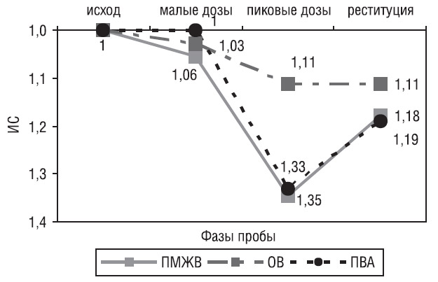 Рис. 2. Изменение регионального ИС в бассейнах, пораженных ВА, при исходном нормальном ИС