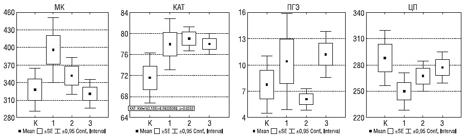 Рис. 1. Уровни МК (мкмоль/л), КАТ (%), ПГЭ (%) и ЦП (мг/л) в контрольной группе (К) и у больных с РС молодого (1), I (2) и II (3) периодов зрелого возраста