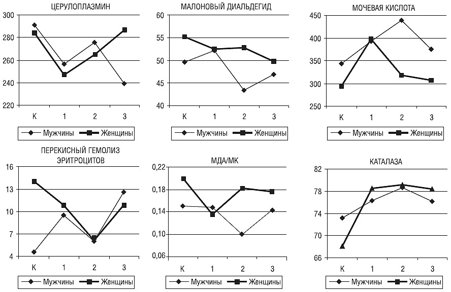 Таким образом, и у мужчин, и у женщин в молодом возрасте и во II период зрелого возраста состояние АОС характеризовалось неустойчивостью, что может быть связано с высокой активностью метаболических процессов в первой возрастной группе, а во второй — с возрастной недостаточностью антиоксидантных механизмов (Жебель В.Н., 1994) и их последующим истощением у мужчин. У женщин при этом отмечали повышение содержания ЦП и относительно стабильный уровень МК и МДА. В I период зрелого возраста отмечали наиболее устойчивое состояние АОС, что у мужчин достигалось максимальным напряжением антиоксидантных механизмов.